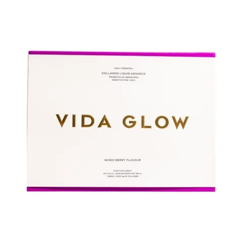 - Vida Glow Collagen Liquid Advance is an example of Victoria Beckham collagen. It is a berry-flavored product for prolonged youth and the perfect appearance regardless of age. The product is packed in individual one-time-use sachets for improved convenience. Each serving has a double dosage of marine collagen and an antioxidant complex, which allows for softening wrinkles and making the skin surface firm and elastic.