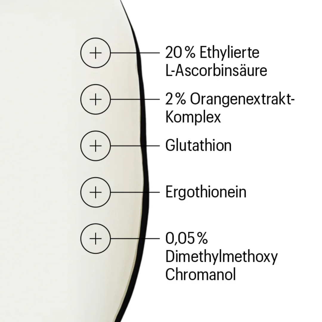 20% Ethylated L-Ascorbic Acid, 2% Orange Extract Complex, 0.05% Dimethylmethoxy Chromanol, Ergothioneine, Propanediol, Glycerin, Aqua, Dimethyl Isosorbide, Tocopherol, Glutathione, Helianthus Annuus Seed Wax, Silica, Sodium Benzoate.