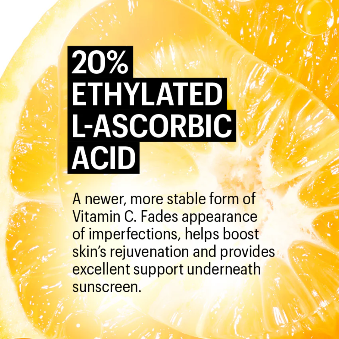 20% Ethylated L-Ascorbic Acid – A stabilised form of Vitamin C that fades pigmentation, boosts collagen, and protects against UV-induced skin ageing.