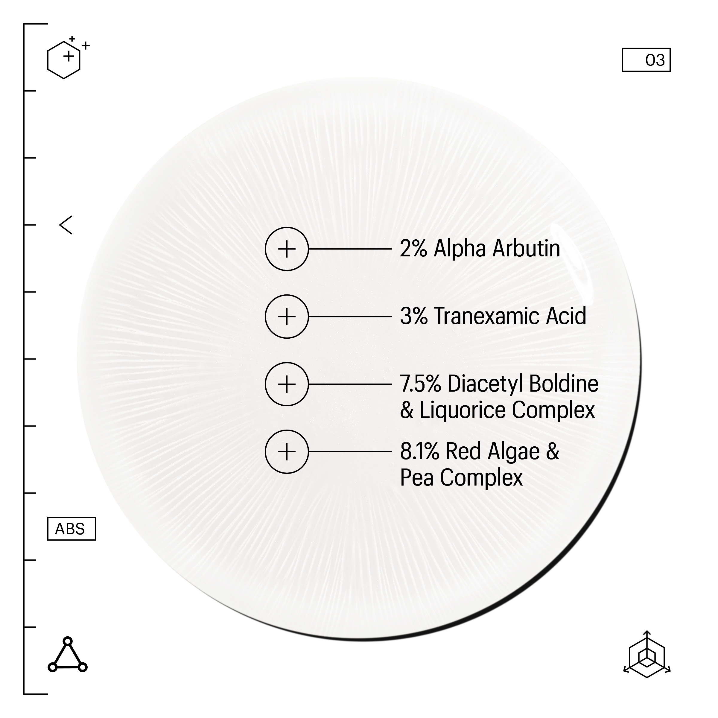 Aqua (Water), Caprylic/Capric Triglyceride, C13-15 Alkane, Tranexamic Acid, Glycerin, Alpha-Arbutin, Pentylene Glycol, Tocopheryl Acetate, Palmaria Palmata Extract, Hydrolyzed Pea, Asparagopsis Armata Extract, Ascophyllum Nodosum Extract, Glycyrrhiza Glabra (Licorice) Root Extract, Pancratium Maritimum Extract, Ganoderma Lucidum Extract, Lentinus Edodes Extract, Lactobacillus Ferment, Hydrolyzed Pea Protein, Diacetyl Boldine & Licorice Complex, Bisabolol, Panthenol, Tocopherol, Glucose, Arginine/Lysine Polypeptide, Pentapeptide-34 Trifluoroacetate, and others.