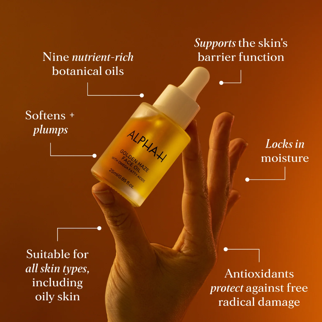 Alpha H Golden Haze Face Oil is a fast-absorbing, luxurious oil designed to nourish, plump, and strengthen your skin’s barrier function.