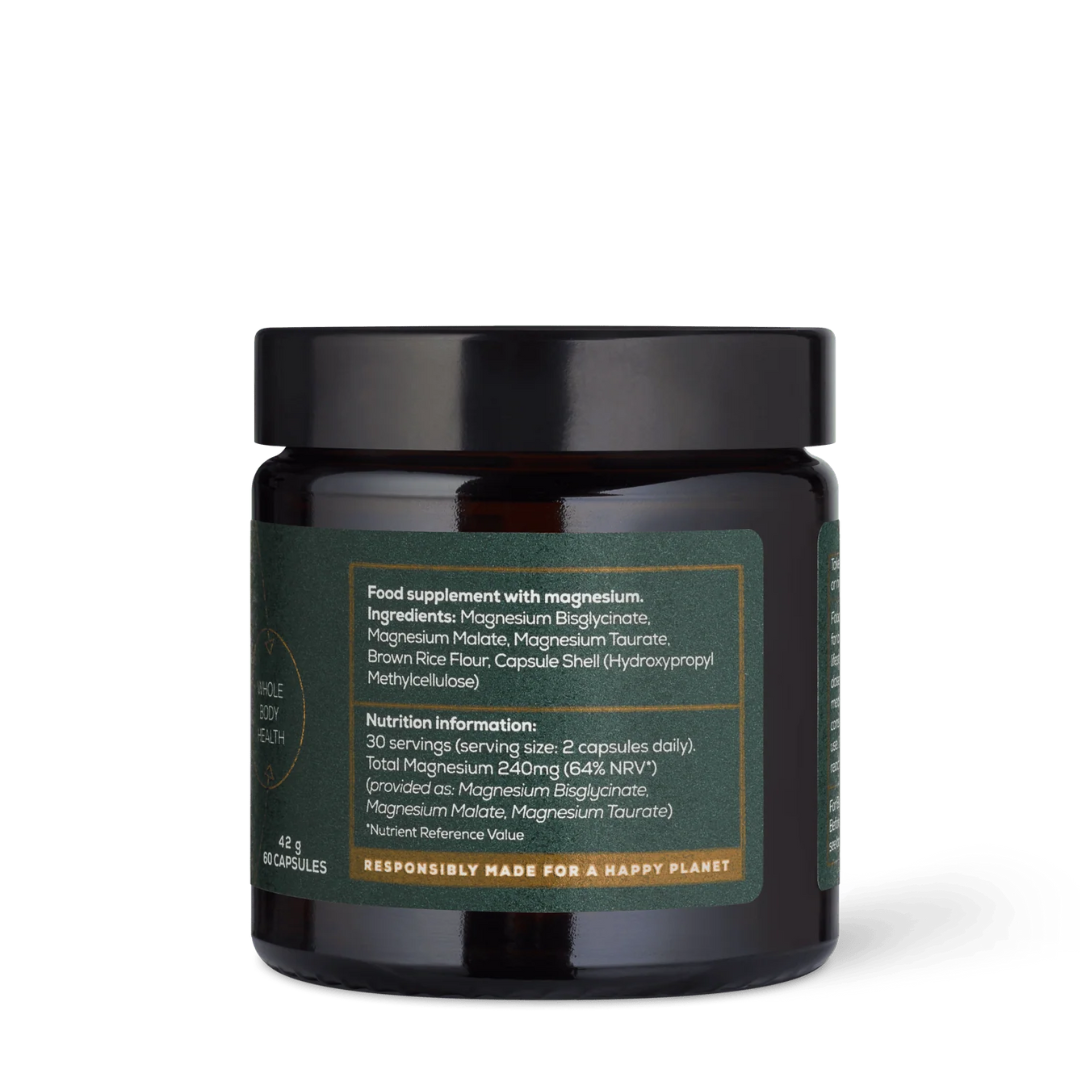 Magnesium Bisglycinate, Magnesium Malate, Magnesium Taurate, Brown Rice Flour, Capsule Shell (Hydroxypropyl Methylcellulose).