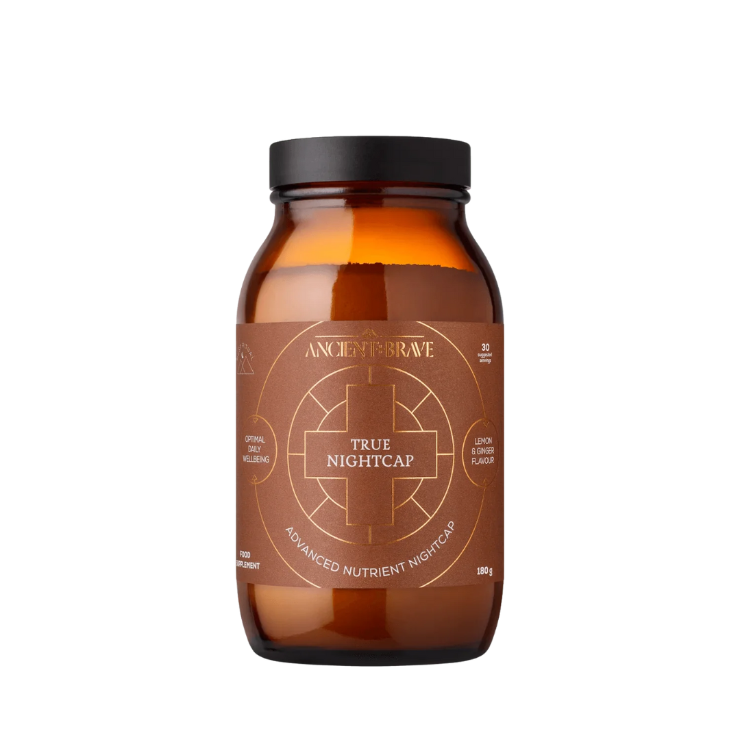Ancient and Brave True Nightcap Jar 180g is a carefully crafted evening tonic designed to gently guide you into a deep and restorative night’s sleep. This nourishing blend combines a thoughtful selection of targeted nutrients including magnesium, zinc, vitamin C, choline, myo-inositol, and calming L-glycine, each chosen for their role in supporting your natural sleep cycle, soothing the nervous system, and promoting overall relaxation.