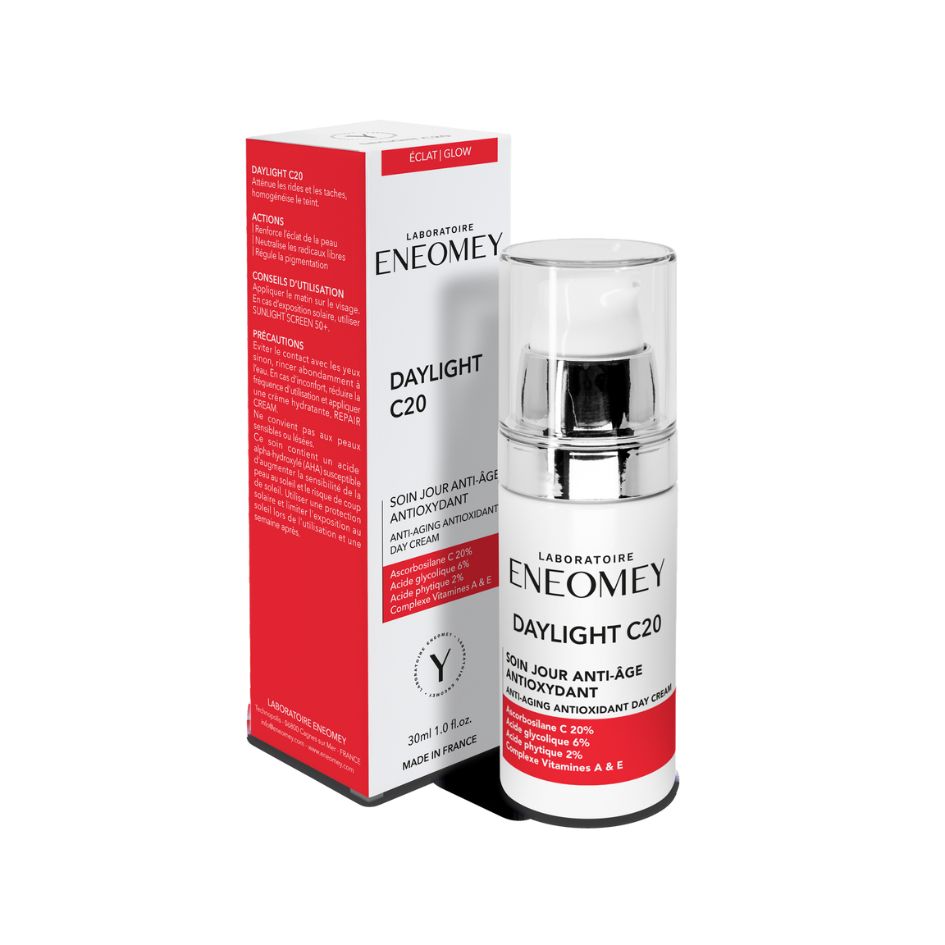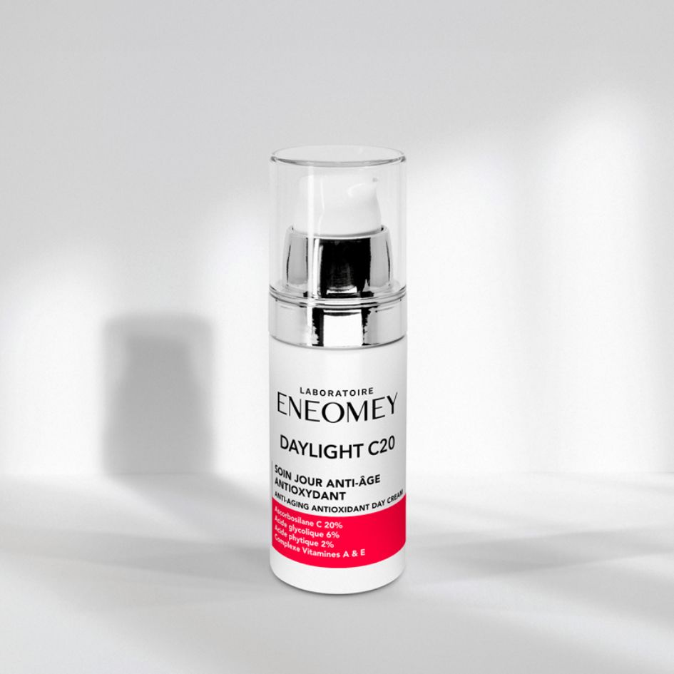 Eneomey Daylight C20 is a powerful anti-aging antioxidant day cream designed to boost skin radiance and fight pigmentation. Formulated with 20% Ascorbosilane C, a stabilized form of Vitamin C, it protects the skin from oxidative stress and neutralizes free radicals.