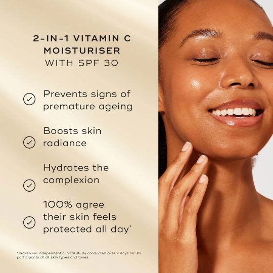 It combines vitamin C, hyaluronic acid, and SPF 30 in one moisturiser for all-in-one skincare.