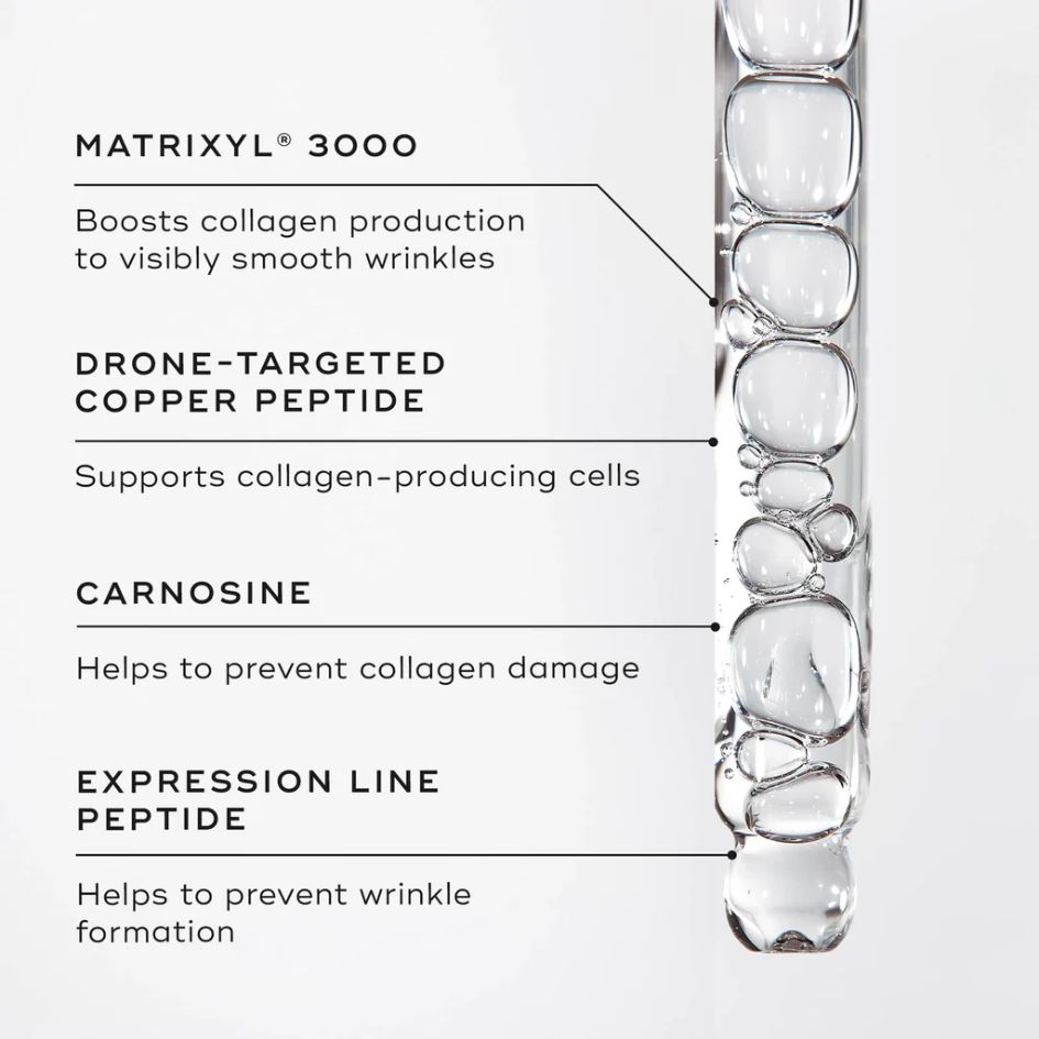 It contains Matrixyl® 3000, drone-targeted copper peptide, expression line peptide, carnosine, and multi-weight hyaluronic acid, all known for powerful anti-aging effects.
