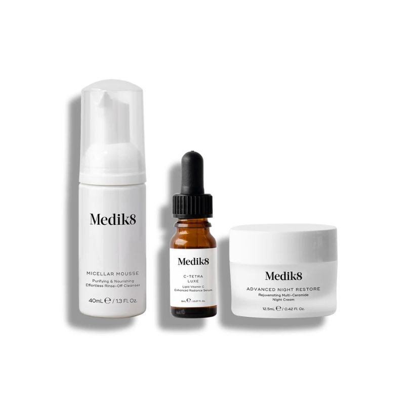 The kit includes three travel-friendly, best-selling products: Micellar Mousse (40ml), C-Tetra Luxe (8ml), and Advanced Night Restore (12.5ml).