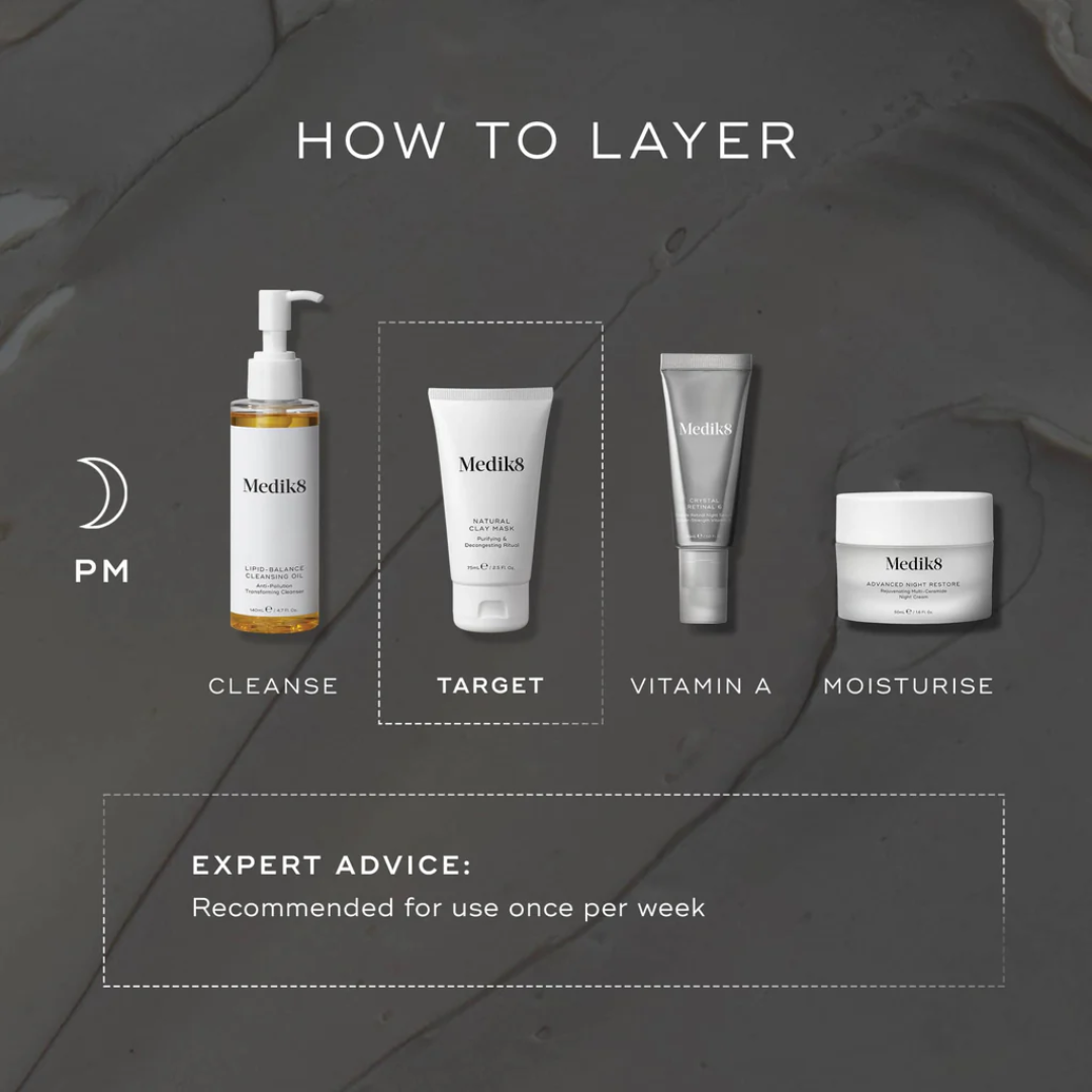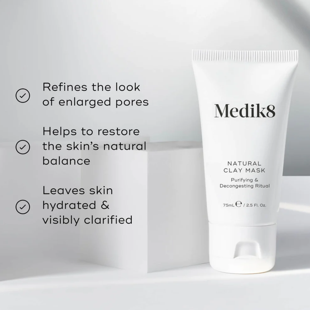 Medik8 Natural Clay Mask 75ml is a mineral-rich treatment designed to clarify and refresh congested skin. Infused with bentonite and kaolin clays, this purifying formula works to visibly reduce the appearance of enlarged pores and absorb excess oil without stripping the skin of moisture. Unlike typical clay masks, it leaves skin feeling soft and hydrated. Cranberry fruit extract provides a boost of antioxidants while soothing botanicals like honeysuckle and passionflower create a relaxing, spa-like experience. Ideal for weekly use, this gentle detox mask offers visible clarity and balanced hydration.