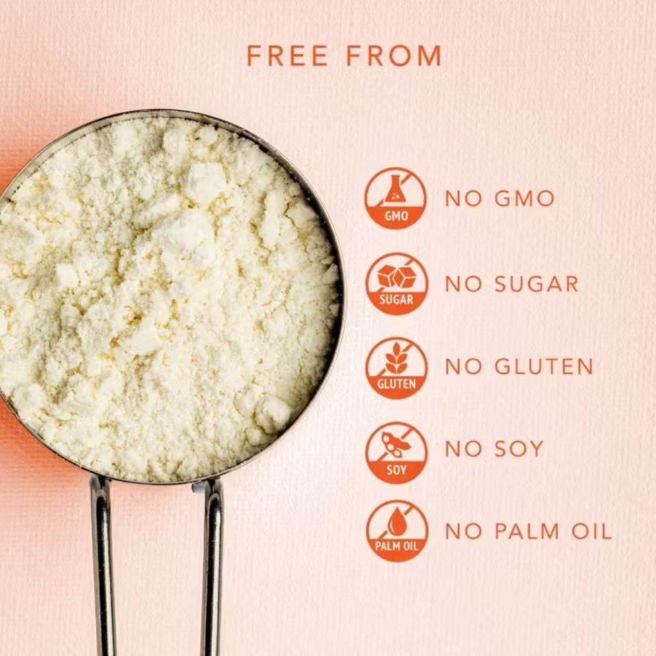 Medium chain triglycerides (coconut derived), butter (milk) from grass-fed herds, coconut oil, milk protein, soluble fibre (resistant maltodextrin), acacia gum, Bacillus coagulans and Bacillus subtilis (heat stable microbiome spores)