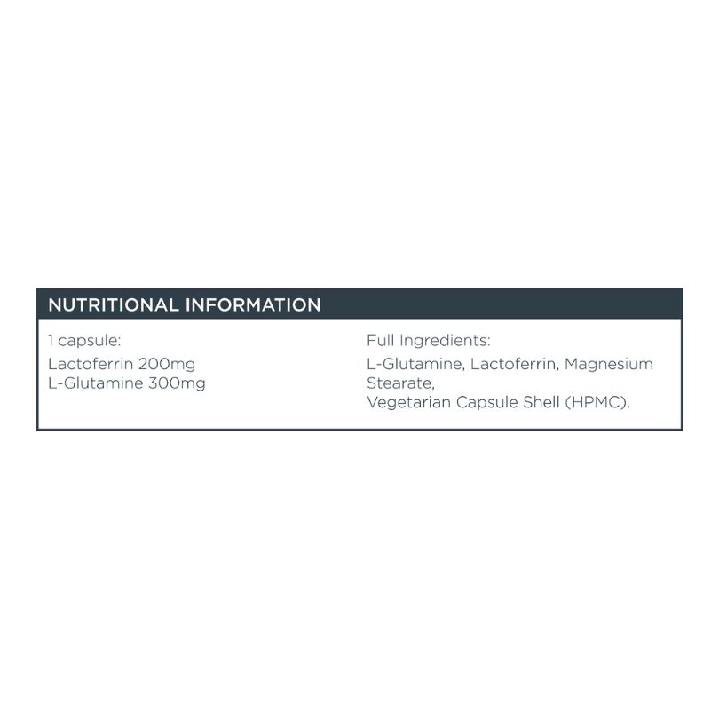 1 Capsule contains: L-Glutamine (300mg), Bovine Lactoferrin (200mg), Magnesium Stearate (flow agent), Vegetarian Capsule (HPMC)