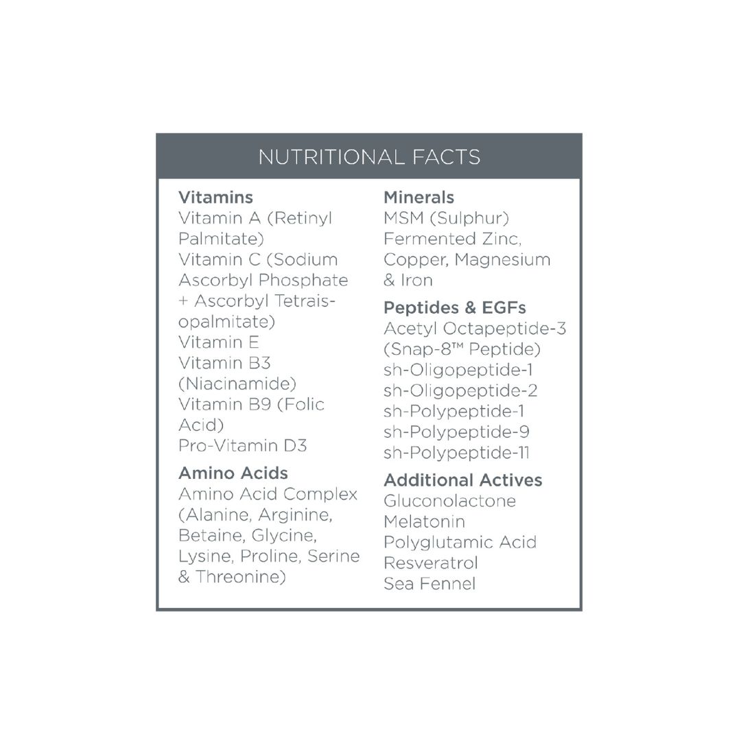 Aqua (Water), Glycerin, Caprylic/Capric Triglyceride, Dimethyl Sulphone (MSM), Niacinamide,Opuntia Ficus-Indica Stem Extract, Cocoyl Proline, Sodium Lactate, Vitis Vinifera (Grape) Seed Oil, Cetearyl Olivate, Sorbitan Olivate, Cetyl Palmitate, Sorbitan Palmitate, Sodium Benzoate, Oat Ceramides, Panthenol, Cetearyl Alcohol, Folic Acid, Xanthan Gum, Polyglutamic Acid, Betaine, Sodium, Sodium Lactate, PCA, Serine, Alanine, Glycine, Glutamic Acid, Lysine HCl, Threonine, Arginine, Proline, Hydrogenated Phosphatidylcholine, Lecithin, Melatonin, Resveratrol, Ubiquinone, Tocopherol, Ascorbyl Tetraisopalmitate, Tocopheryl Acetate Glyceryl Linoleate, Glyceryl Linolenate, Retinyl Palmitate, Sodium Ascorbyl Phosphate, Lentinus Edodes Extract, Trametes Versicolor Extract, Crithmum Maritimum Extract, Acetyl Octapeptide-3, Acetyl Glutamine, sh-Oligopeptide-1,sh-Oligopeptide-2,sh-Polypeptide-1,sh-Polypeptide-9,sh-Polypeptide-11, Bacillus/folic Acid Ferment Extract, Sodium Hyaluronate, Saccharomyces/Zinc Ferment, Saccharomyces/Copper Ferment, Saccharomyces/Magnesium Ferment, Saccharomyces/Iron Ferment, Saccharomyces/Silicon Ferment, Gluconolactone, Pentylene Glycol, Butylene Glycol, Glyceryl Undecylenate, Propanediol, Caprylyl Glycol, Olus Oil / Vegetable Oil, Sorbitol, 1,2-Hexandiol, Polysorbate 20, Sodium Hydroxide, Lactic Acid