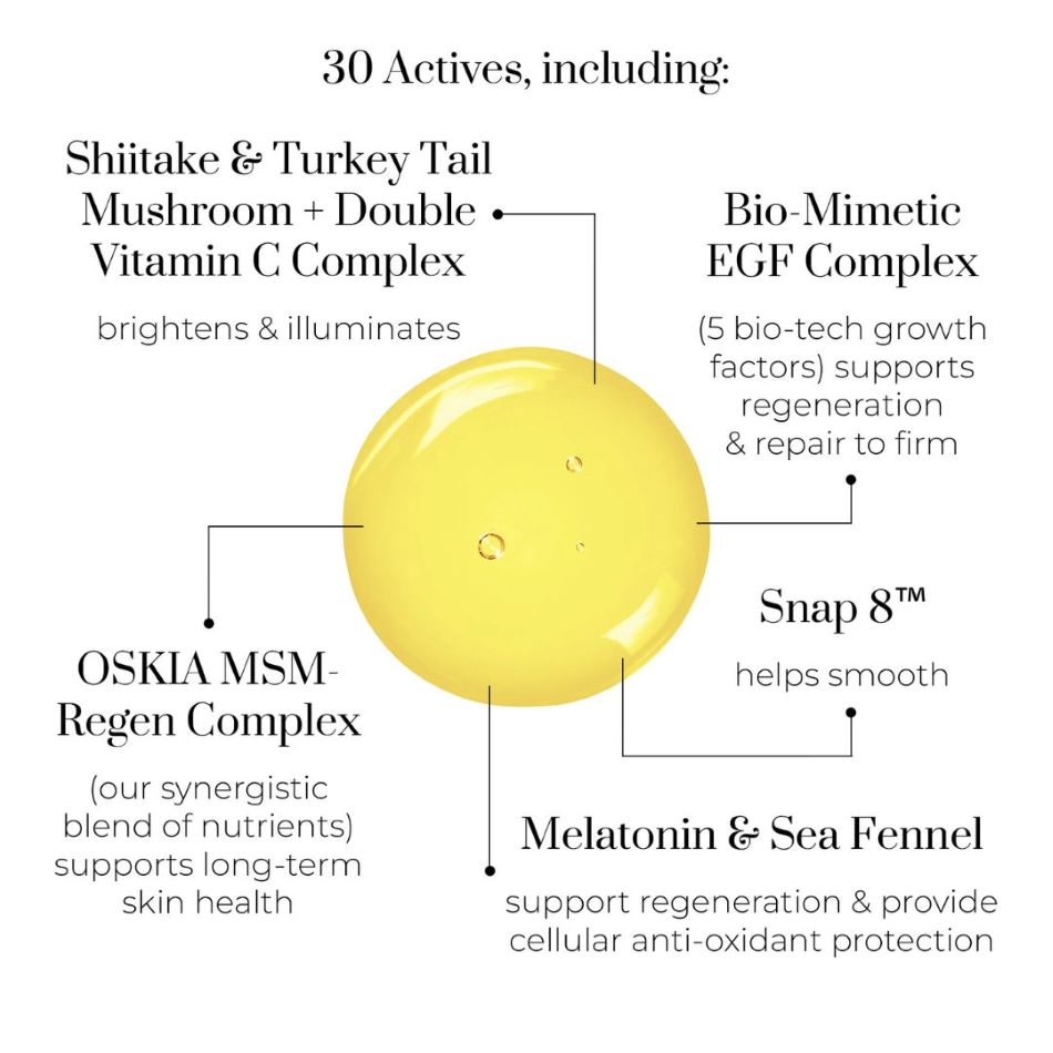 This serum features Bio-Mimetic Growth Factors, Snap-8™ Peptide, Melatonin Liposomes, and OSKIA’s MSM-Regen Complex to promote firm, bright, and smooth skin.
