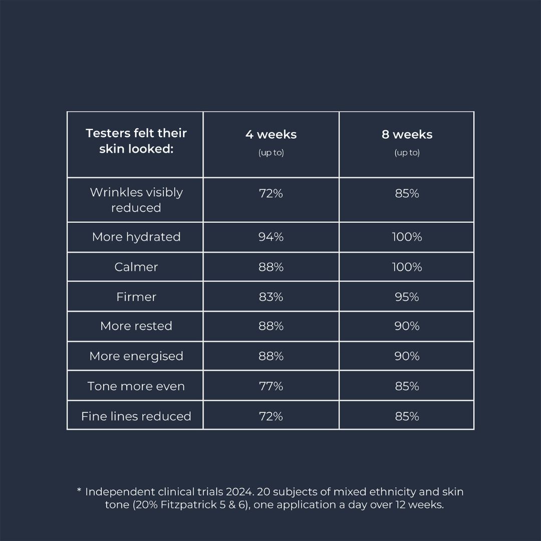 Expect improvements in skin firmness, elasticity, hydration, and clarity, as well as a reduction in fine lines, wrinkles, and signs of fatigue by morning.