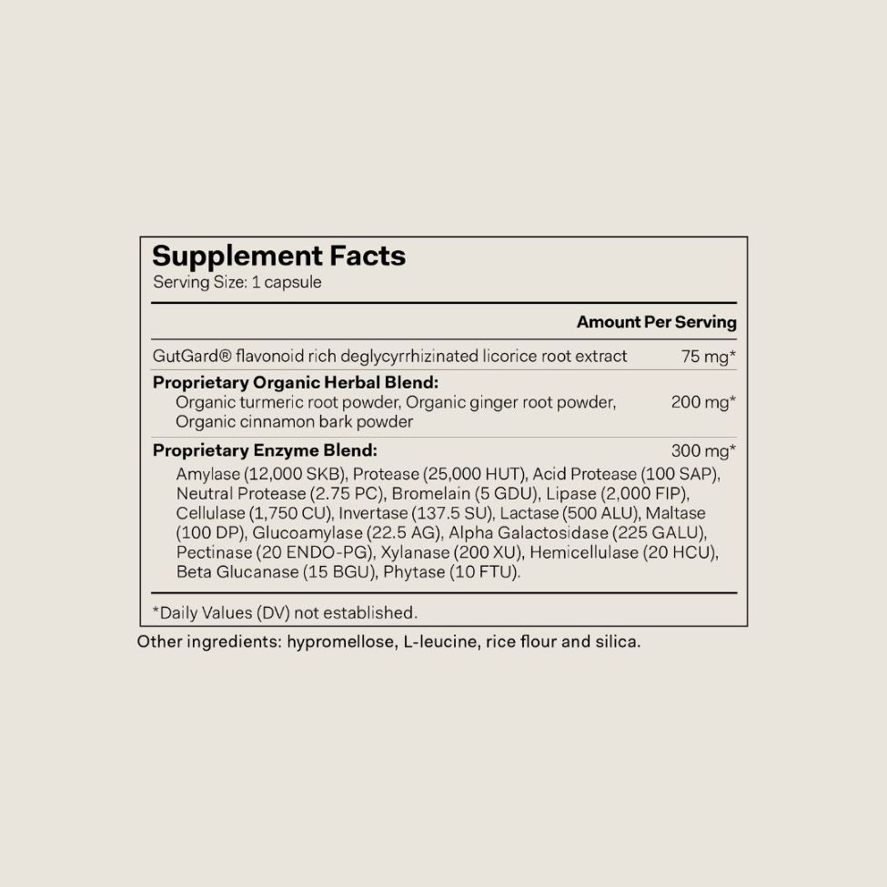 Proprietary enzyme blend, Gutard® licorice root extract, Organic cinnamon powder, organic ginger, organic tumeric powder.