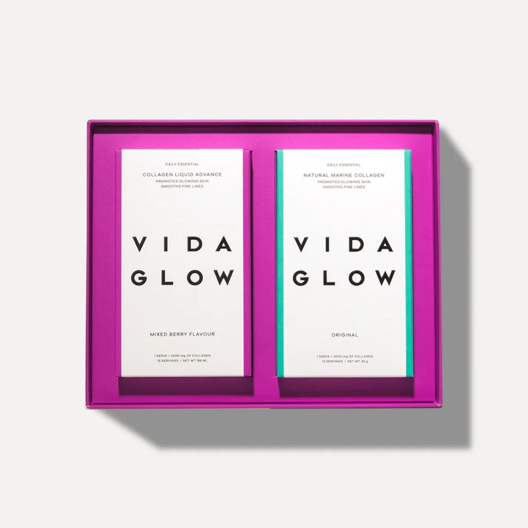 The set includes two types of Vida Glow collagen: Natural Marine Collagen in powder form and Collagen Liquid Advance in convenient, ready-to-drink sachets.