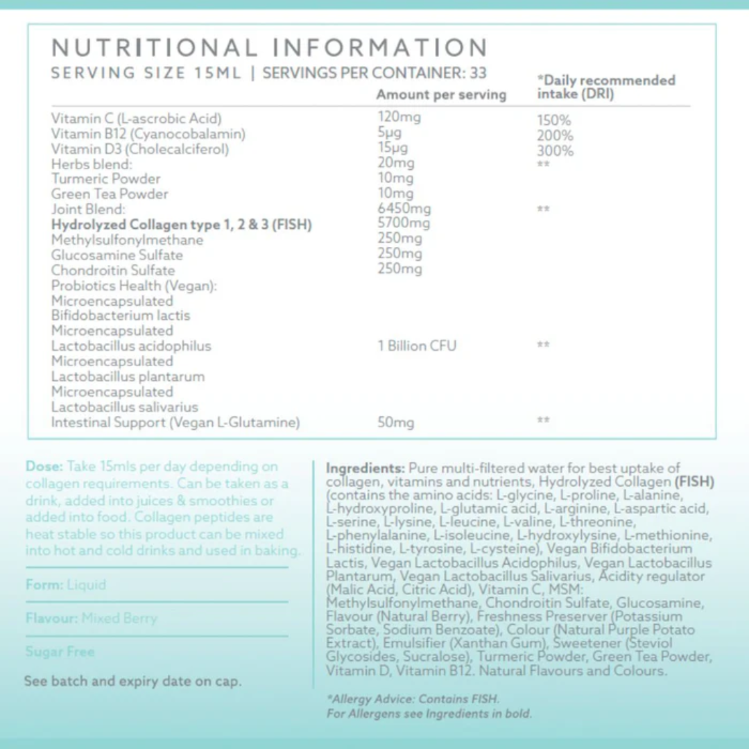 Types 1, 2 & 3 Marine Collagen (Fish), Chondroitin Sulfate (Bovine), Glucosamine Sulfate (Corn-derived), MSM, Encapsulated Probiotics (Bifidobacterium Lactis, Lactobacillus Acidophilus, L. Plantarum, L. Salivarius), Vitamin C, B12, D, Turmeric, Green Tea Powder, L-Glutamine, Stevia, Sucralose, Natural Flavours & Colours.