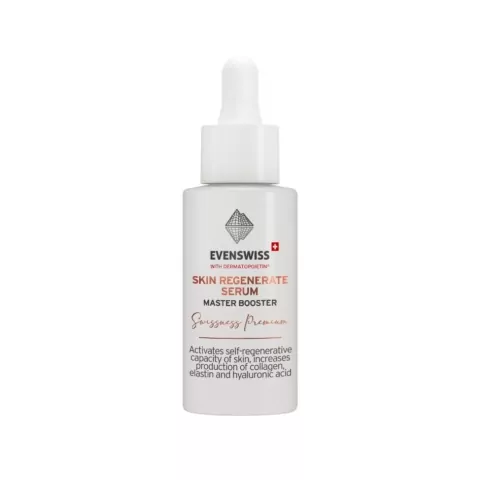 Evenswiss Skin Regenerate Serum is an effective product for aging epidermis. The concertation of Dermatopoietin in cells is 8x, which creates a powerful blend of nutrients and activates the self-regenerative capacities of cells. Regular application increases the synthesis of elastin, hyaluronic acid, and collagen by 90%.